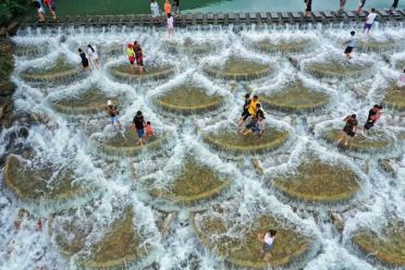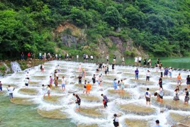 据工程设计师周卡雷介绍,鱼鳞坝虽是一个水利工程,但设计的初衷就是希望能利用优异的地形条件,打造成特色景观,利用鳞次栉比的溪坑来增加与游客的互动性,把水深控制得很浅,不仅可以让游客安全放心地游玩,而且颇具观赏性、可玩性和趣味性。