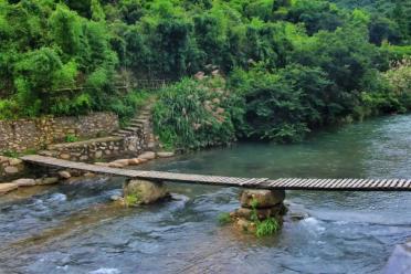 在澄净如镜的溪水中,鹅卵石铺筑的叠式堰坝,倾泻而下的水流形成层层叠叠的白色水花,变幻出梦幻般的色彩,或清泉叮咚,或细水慢流。
