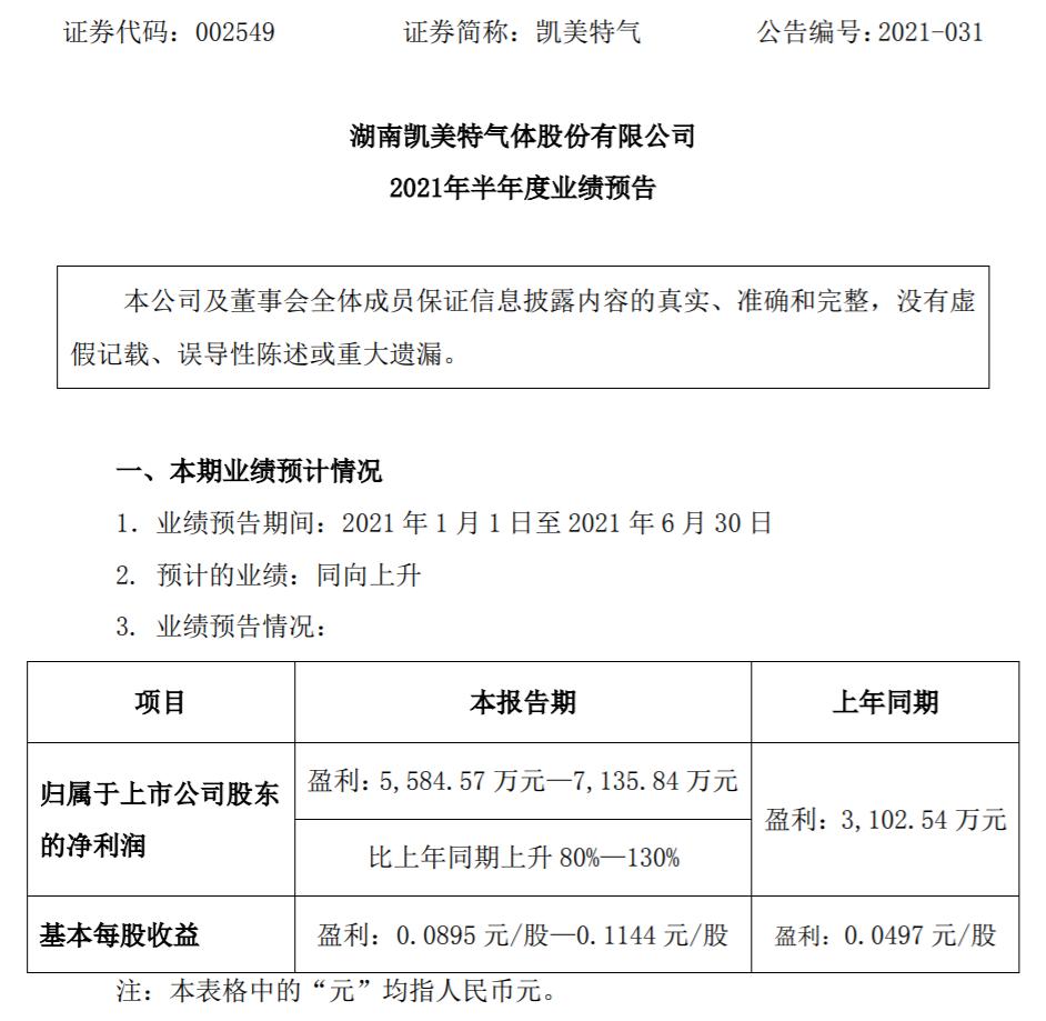 6月28日晚间,A股上市公司凯美特气(002549.SZ)发布2021年半年度业绩预告,预计归属于上市公司股东的净利润为盈利5584.57万元-7135.84万元,比上年同期上升80%-130%。