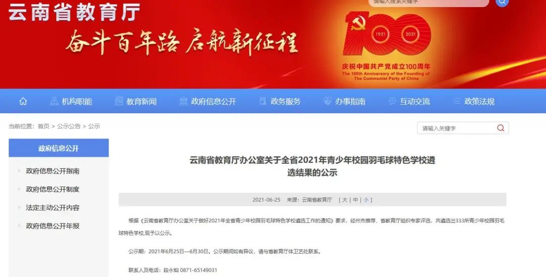 根据《云南省教育厅办公室关于做好2021年全省青少年校园羽毛球特色学校遴选工作的通知》要求,经州市推荐、省教育厅组织专家评选,共遴选出333所青少年校园羽毛球特色学校,现予以公示。公示期:2021年6月25日—6月30日。公示期间如有异议,请与省教育厅体卫艺处联系。