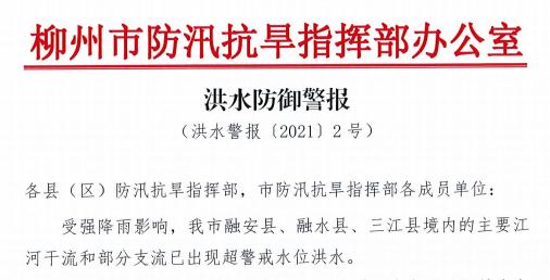 据柳州水文中心预测,未来8〜10小时,古宜河三江县古宜镇河段将出现超警戒水位(152.6米)0.5米左右洪水;未来14~16小时,融江融安县长安镇河段将出现超警戒水位(114.6米)2米左右洪水;未来16~18小时,融江融水县城河段将出现超警戒水位(106.6米)4米左右洪水;未来30~32小时,柳江柳州市区河段将出现警戒水位82.5米左右洪水。滨江西路延长线已封闭