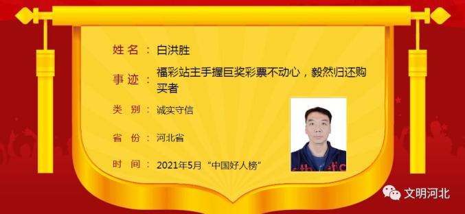 白洪胜,男,1975年出生,沧州市新华区东环新开路社区居民,福彩彩票投注站站主。2020年7月2日,一市民让白洪胜代选了5注双色球,彩票就放在了白洪胜那儿。当天晚上,他代选的彩票中了556万元的一等奖。彩票不记名、不挂失,但白洪胜手握巨奖彩票,不为所动,将大奖“归还”购买者。“人家信任咱,才把彩票放到咱这儿。大家都守信用,这个社会才会更好。”白洪胜说。白洪胜的事迹先后被沧州晚报、腾讯网、搜狐网等媒体报道。