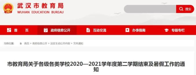 7月1日,武汉市教育局发布《市教育局关于各级各类学校2020—2021学年度第二学期结束及暑假工作的通知》。