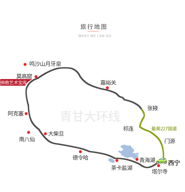 途中涉及景点:青海湖、茶卡盐湖、U型公路、东台吉乃尔湖、水上雅丹、翡翠湖、石油小镇、敦煌石窟、鸣沙山、嘉峪关、阳关、七彩丹霞。涉及住宿城市县城:西宁、德令哈、大柴旦、敦煌、张掖。