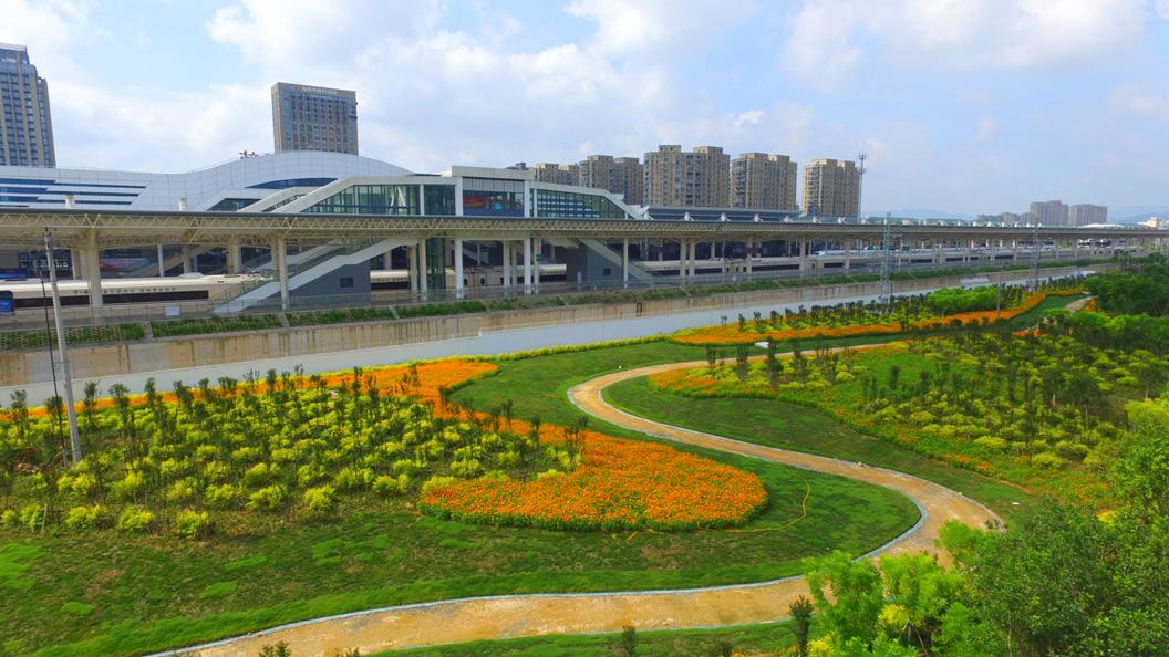 位于苍南站站台北侧的微型公园,公园里金黄的硫华菊连片绽放,宛若一幅绣制在苍南站后面的“背景画”。谢上师 摄来源:温州发布