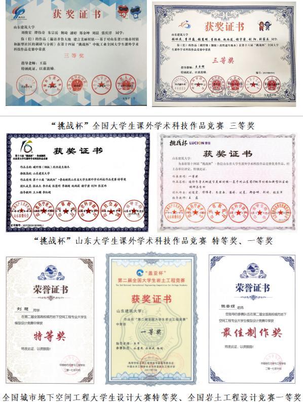 本专业在校生规模位居山东省首位,学生在全国城市地下空间工程设计大赛、岩土工程设计大赛中多次荣获特等奖和一等奖,获奖成绩和获奖人数均名列全国高校前列。近三年,学生就业率均在95%以上,考研率在30%以上,7人被评为全国优秀毕业生,学生培养质量得到同行及社会的广泛好评。