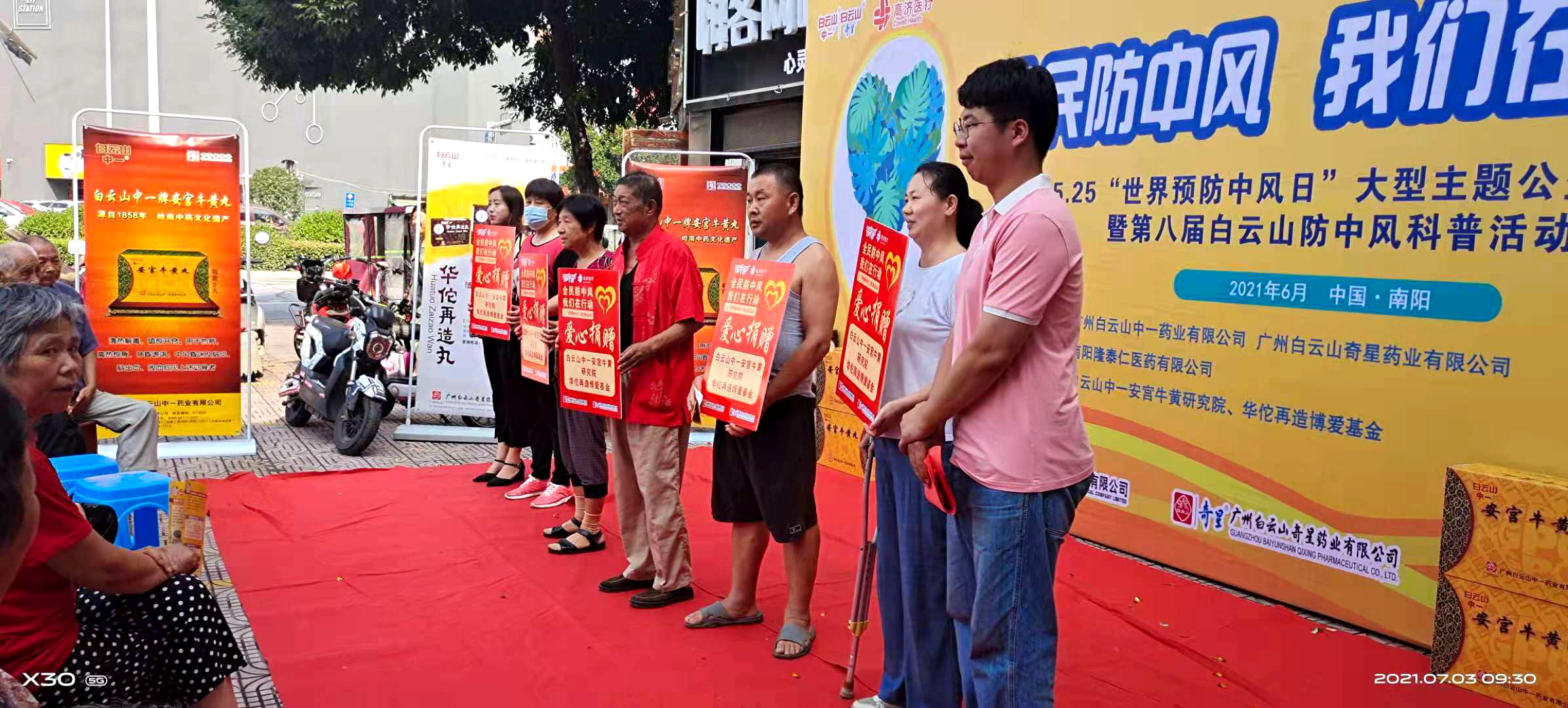 普及中风知识,预防中风风险。在世界预防中风日宣传期间,广州白云山中一药业、白云山奇星药业联合全国近100家连锁药店在广东、湖北、辽宁、广西、河南、山东、湖南等省市启动2021年“世界预防中风日”主题公益活动,旨在唤醒民众预防中风的意识,并给予中风康复患者及其家庭更多关爱。7月2日,公益活动走进南阳,在南阳隆泰仁医药有限公司举行。活动现场,专家为老人免费量血压,为大家普及预防中风的知识,学习识别中风的先兆,介绍中风的康复治疗注意事项,为参与者进行一堂生动有趣有料的讲座。