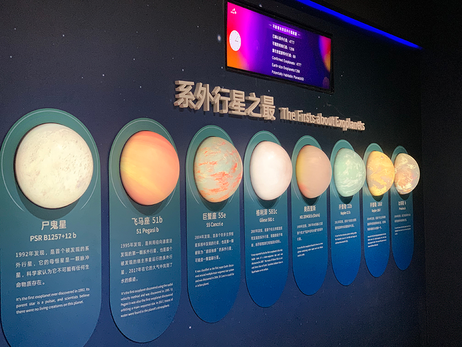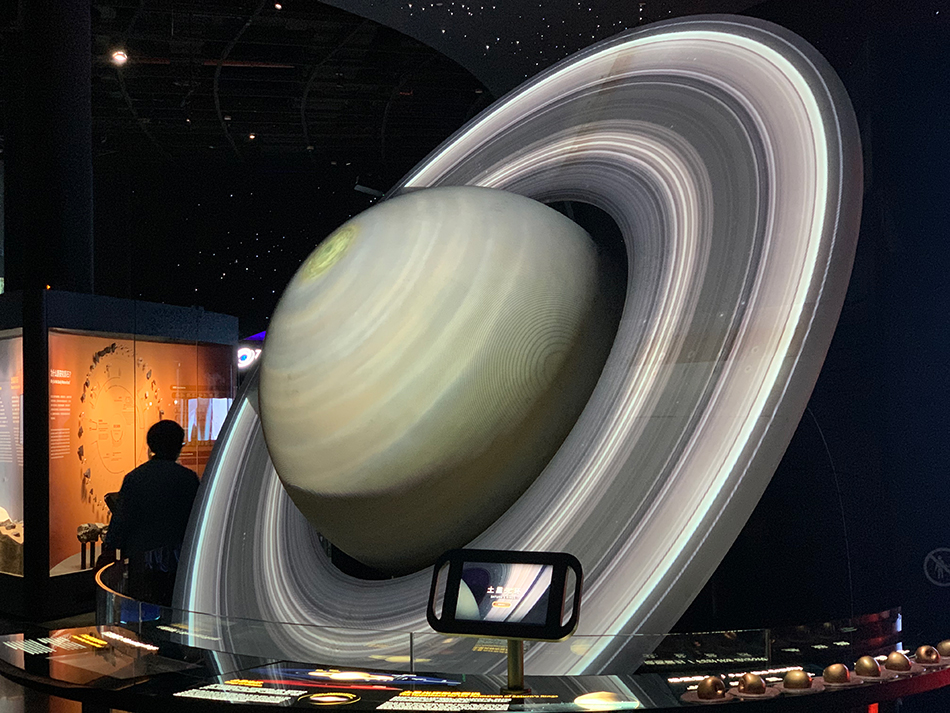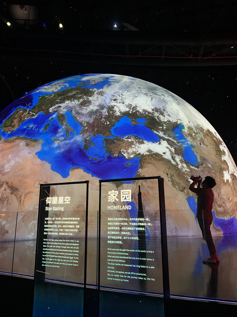 走入正门,第一个展厅就是“家园”,地球、月球和太阳以巨大的尺度出现在面前。外部直径20米的天象厅外层被投影成地球的形态,交替展现从太空中看地球的景象;地球旁边是巨大的月球模型,二者大小比例与真实的地球和月球比例一致,月球模型表面则是根据嫦娥探月等航天探索获得的真实数据构建,细节几可乱真。