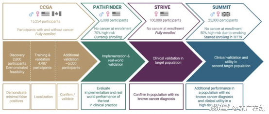 2016年底,GRAIL启动“循环游离基因组图谱”计划(CCGA计划),通过对病人和健康人群的游离DNA进行提取、测序,比较二者之间的差异,为早期诊断提供帮助。CCGA研究的成果,已经可以达到超过99%的特异性和55%的敏感性;在超过90%的阳性测试中,GRAIL准确的识别出了肿瘤信号的定位。CCGA研究的成果被GRAIL转化成了两款产品,Galleri和DAC(diagnostic aid for cancer test)。 2019年5月,美国FDA授予了Galleri“多癌种早期检测产品”突破性设备称号。