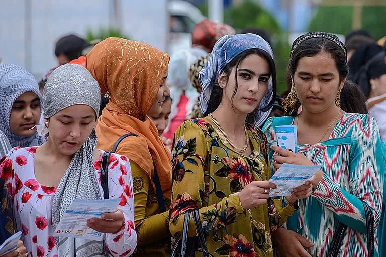 这个地方就是塔吉克斯坦。当地女性化妆几乎只化眉毛——用乌斯玛(黑色的炭笔)画在鼻子的鼻梁上,将眉毛连接在一起。