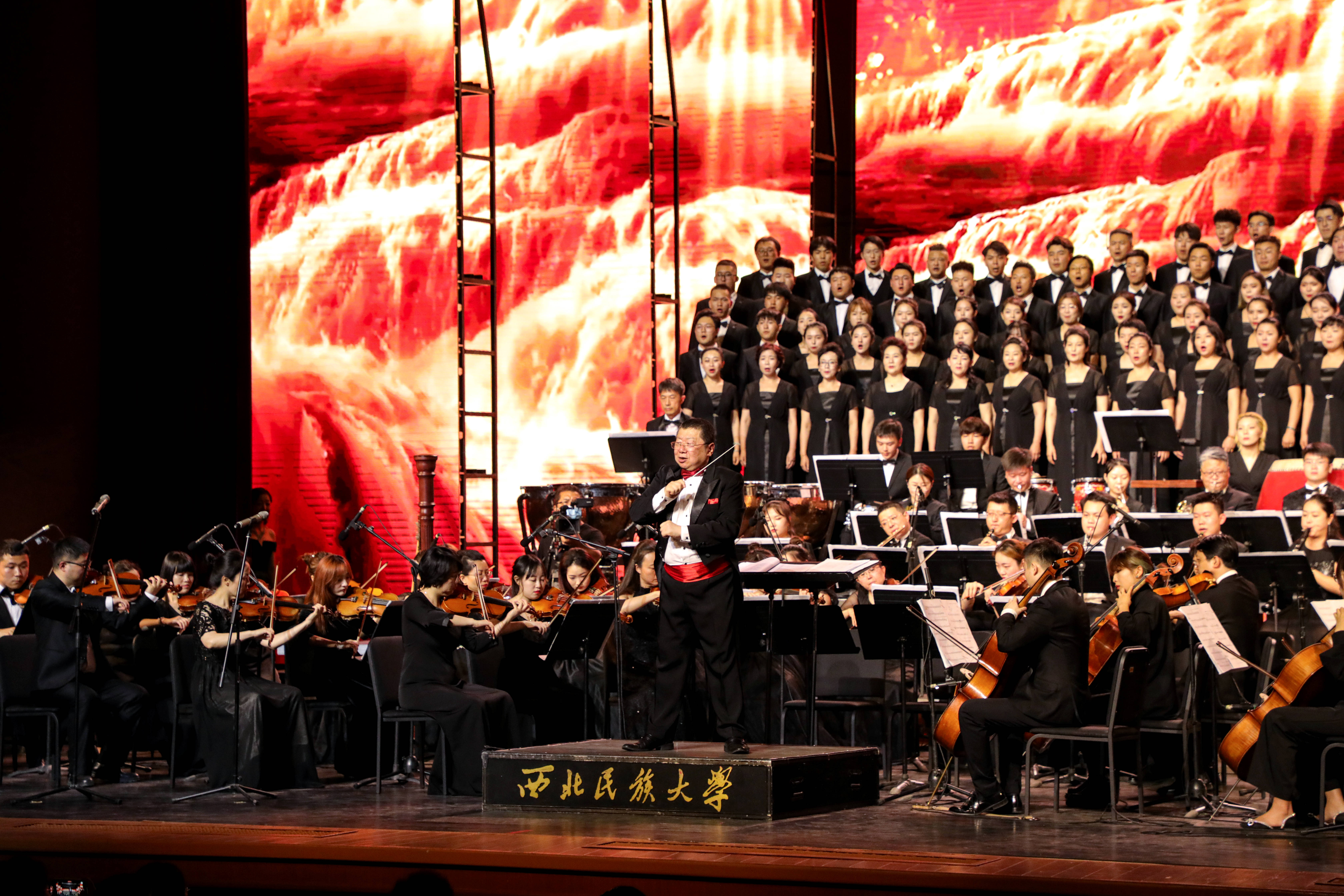 研讨会期间,与会专家学者与近千名师生共同观看了西北民族大学“百年风华 宏音颂党”——专场音乐会。音乐会特邀中国音乐家协会合唱联盟副主席曹丁、北京青年交响乐团常任指挥韩多多担任指挥,与该校音乐学院师生联袂奏响红色旋律。铿锵有力的《黄河大合唱》响彻西北民族大学。《黄河船夫曲》《黄河颂》《黄河之水天上来》《黄水谣》《河边对口曲》《黄河怨》《保卫黄河》《怒吼吧!黄河》,乐声嘹亮,激荡人心,带领观众领略中华民族渊远流长的历史,感受奔流不息的黄河精神,体验经典交响合唱的独一无二的魅力。