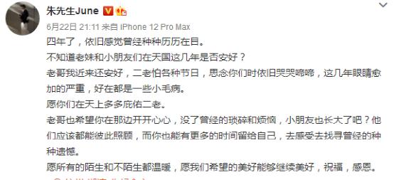 今年的6月22日,杭州保姆纵火案4周年,当天深夜,朱哥哥发了一条消息。