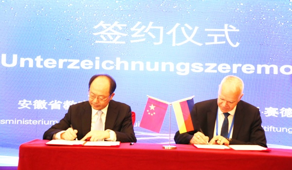 大会举行了签约仪式,钱桂仑和乔治·施泰德作为双方代表签订了合作协议。未来双方将围绕“教学方案研讨”、“提升教师教学以及实践能力”、“引入以实践为导向教学理念”为主题的师资培训,建立建设能力培训中心,建立教学质量管理体系等方面开展合作,进一步增进中德两国在教育领域的交流与友谊,促进安徽省职业教育发展。