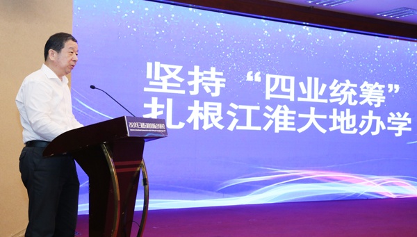 储常连以《坚持“四个统筹”扎根江淮大地办大学》为题,强调要坚持产业、专业、创业、就业“四业统筹”,开创教育业人才链、产业链、创新链衔接贯通。他指出,双元制教育是学校教育和企业教育的有机结合,是深化产教融合、双方互利共赢的结合点。要围绕产业发展渠道,优化调整学科专业;建设一流学科,服务创新创业;深化教育教学改革,探索应用型人才培养新模式;激活师生创新创业活力,实现创新引领创业、创业带动就业。