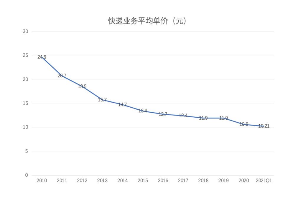 从2010年开始,我国快递行业平均单价呈现逐年下降的趋势,从2010年的24.57元/件下降至2020年的10.55元/件,2021年1月持续下降至10.21元/件。行业加速整合,价格战成唯一武器。