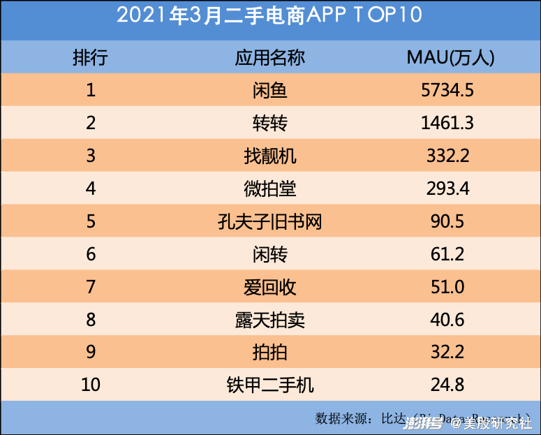 据阿里集团官方数据,闲鱼2020财年GMV超过2000亿元,卖家超过 3000万。比达数据的统计指出,在按月活计算的排行榜上,闲鱼2021年3月MAU以5734.5万人超过了后面九大平台之和,电商的经营根底让闲鱼遥遥领先。