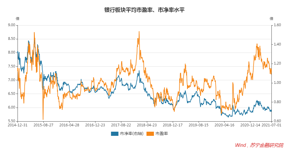 截止2021年7月1日,A股上市银行板块整体市盈率7.41倍,以2014年末至今为衡量区间,市场分位值为81.3%;市净率0.72倍,同期市场分位值为13.6%。若看市盈率,当前银行板块估值已然不低;若看市净率,则板块估值仍处于底部位置。