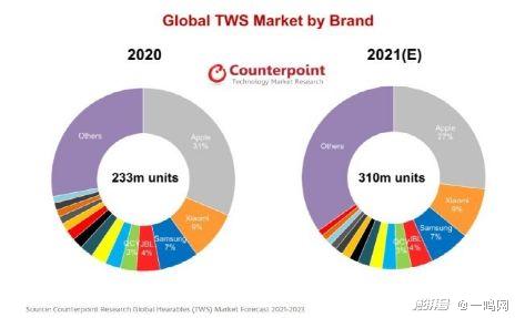 今年5月,Counterpoint发布了2020年全球TWS真无线蓝牙耳机市场份额数据,该榜单的前五名分别是:苹果(31%)、小米(9%)、三星(7%)、JBL(4%)、QCY(3%)。