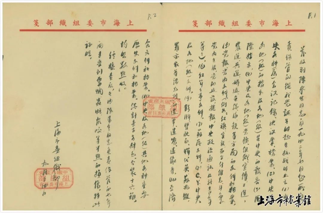 中共上海市委组织部关于接收陈来生保管的中央文库档案的证明(上海市档案馆藏)