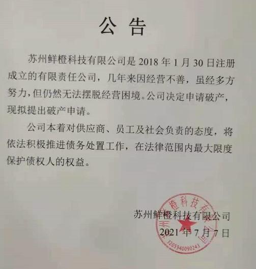 7月8日,同程生活运营主体——苏州鲜橙科技有限公司的创始人、董事长、CEO何鹏宇在向合作伙伴、员工、投资人发出的内部信中承认,“几天前,我们还一度希望通过业务转型,让公司走出社区团购行业所面临的经营困境。但由于合作伙伴集中催款、公司资金链面临断裂,已无再谋求转型的空间”,“不得以选择破产”。
