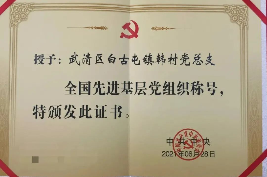 在6月28日召开的全国“两优一先”表彰大会上,白古屯镇韩村党总支荣获全国先进基层党组织,村党总支书记王振江代表韩村党总支在人民大会堂领奖。