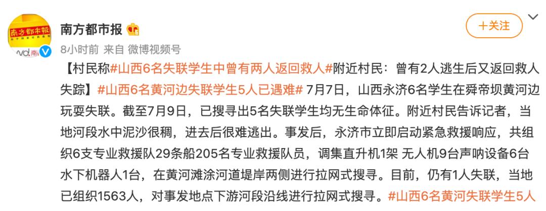 央视新闻:山西永济6名学生黄河溺水失联 已有5人遇难