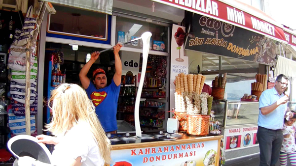 土耳其大叔用来耍宝的maraş dondurması,为什么可以扯那么长而不断?之所以可以扯那么长,是因为冰淇淋里面加了一种叫兰茎粉的东西,它可以增加冰淇淋的粘稠度,兰茎粉由土耳其当地出产的野生兰花根茎压碎制成,只产于土耳其,因此这是一种局限于本地的美味。Maraş dondurması(英语世界另外给它一个名字叫Dondurma)在口中质感浓稠,拿在手里也不怎么容易化掉,由于添加了乳香(对,就是天主教做弥撒时使用的那种香料),混以主料山羊奶,吃起来齿颊生香。卖冰淇淋的大叔经常不忘捉弄一下买冰淇淋的人,将冰淇淋车敲得震天响,将放好的冰淇淋球收回去,同时表现下冰淇淋的粘稠度和幽默感,尽管后面还有排队的人。这时不必着急甚至发火,把自己当作一个看街头戏法的孩子就好,享受这场表演。