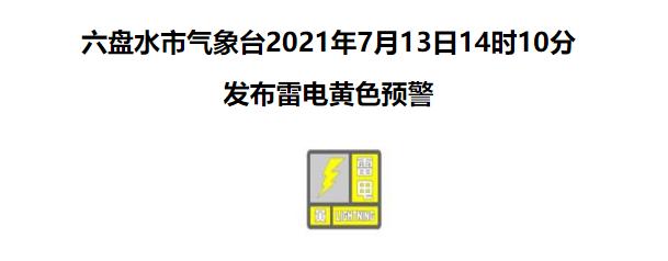 六盘水市气象台2021年7月13日14时10分发布雷电黄色预警:目前我市钟山北部、盘州北部出现较强雷达回波,预计未来6小时我市水城、钟山、盘州北部将出现雷雨天气,局地雷雨中伴有短时强降水、大风、小冰雹等强对流天气,请注意防范。