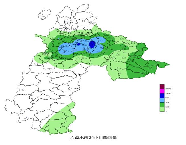 12日08时~13日08时,全市共出现2乡镇(4站点)暴雨(单位:毫米,水城区阿戛镇余家寨66.2、阿戛55.2、马场村54.6,米箩镇俄戛56.0),7乡镇大雨,12乡镇中雨,26乡镇小雨。中雨以上量级降水主要集中在水城区、六枝特区东部和西北部,最大小时雨强为水城阿戛镇余家寨53.9毫米(12日21时~22时)。水城米萝镇米萝出现7级(17.1米/秒)雷雨大风、阿戛镇盐井出现7级(16.1米/秒)雷雨大风。大于10毫米降雨量的乡镇如下(单位为毫米):