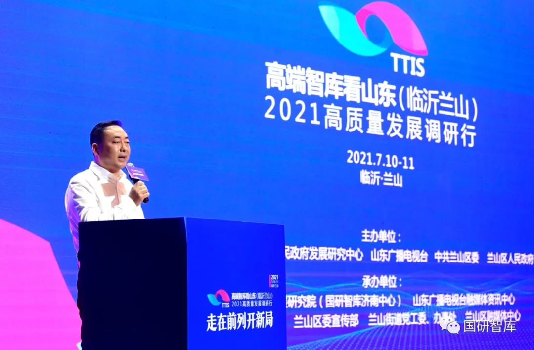 7月11日,“高端智库看山东(临沂兰山)”2021高质量发展调研行交流座谈会在临沂举行国研智库讯 7月10日-11日,由国研智库、山东省人民政府发展研究中心、山东广播电视台、中共兰山区委、兰山区人民政府主办,山东省高质量发展研究院(国研智库济南中心)、山东广播电视台融媒体资讯中心、兰山商城管委会、兰山区委宣传部、兰山街道党工委、兰山街道办事处、兰山区融媒体中心承办的“高端智库看山东(临沂兰山)”2021高质量发展调研行在临沂市兰山区展开,并于11日上午举办交流座谈会。来自国家高端智库、国家有关部委及山东省内的近20位领导专家参加本次调研活动并出席座谈会。