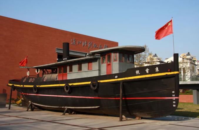 ▲被评定为国家一级文物“京电号”小火轮,永久陈列在渡江胜利纪念馆的广场中央。强渡长江,运煤船成“渡江第一船”