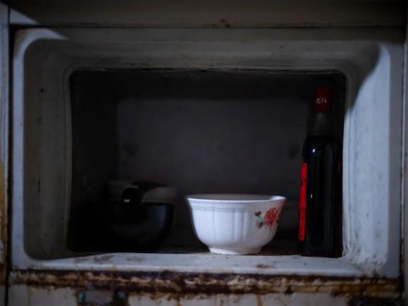 ● 废弃的冰箱里摆放着平日里用的碗筷。