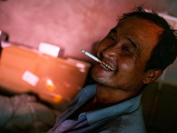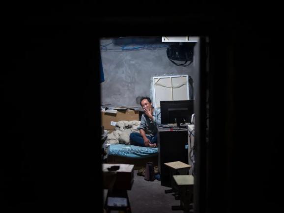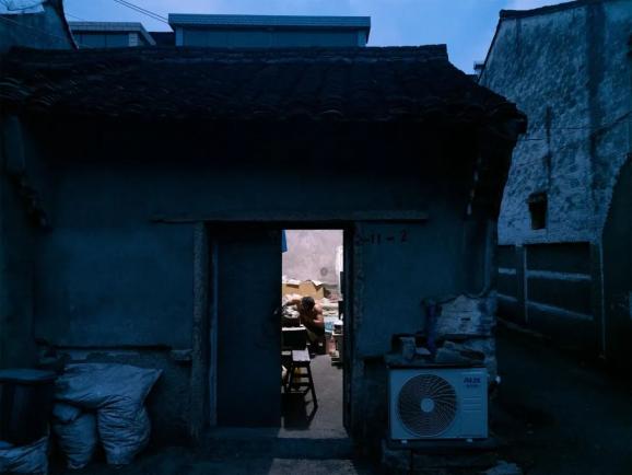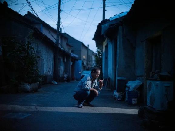 ● 入夜清凉,位光明蹲在屋外消暑。位光明没想过自己还能靠卖画赚钱。让他重拾画笔的是一笔意外的订单,厂里相熟的人托他画一幅油画作为家中装饰,并主动支付了三百元。他没接触过油画,完成得不好,却填补了夜晚的苦闷。这些年里睡不着的晚上,他总在门外转来转去,“像傻子一样”,而画起了画,“门一关,就是自己的一个世界。”
