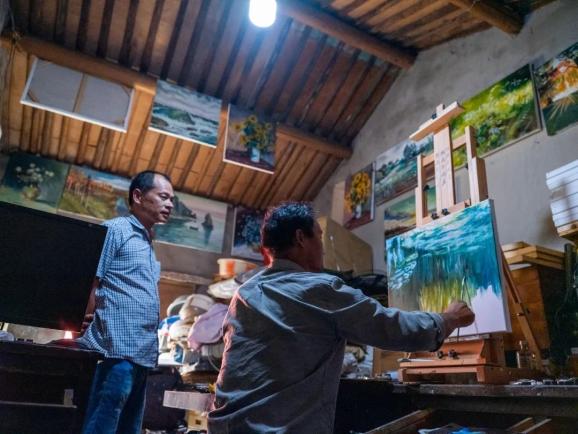 不到4个小时,一幅莫奈的《睡莲》临摹画作已经成型。位光明将它挂在房梁上,和数十幅定制风景油画并排,等待晾干、寄出。位光明并不满意这幅新画,仍习惯性地拍视频、上传,一分钟后,订购需求就从他的信息栏里弹了出来。他索性卖掉这幅“半成品”,数了数待完成的油画订单,有近300幅,按照目前的速度赶工,要到年底才能画完。