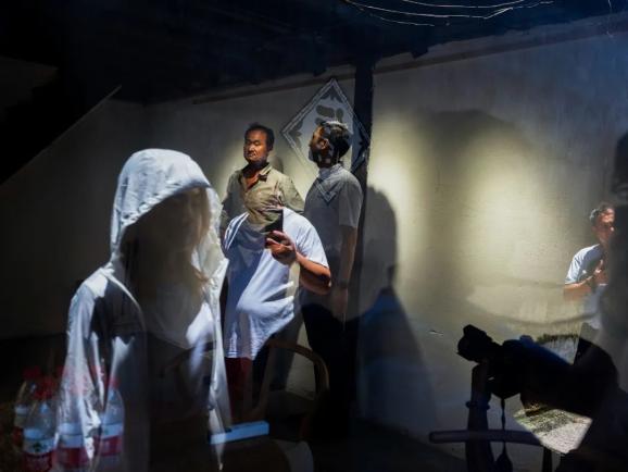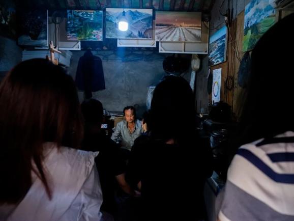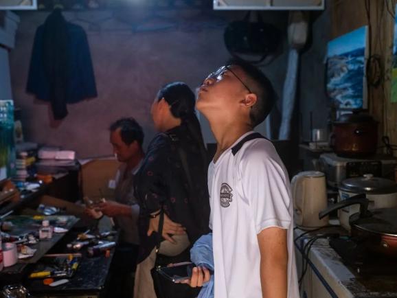 ● 一位母亲带着孩子来参观位光明的“画室”。慕名而来的人们不停地挤进这条巷子,在他作画时推门而入,占掉了他本就因赶订单而仓促的时间。不久前,他收到了2021年杭州艺术博览会的参展邀请,却也无暇为此多做准备。他自知需要磨练画技,但更需要卖画的钱来支付四个儿子的学费。
