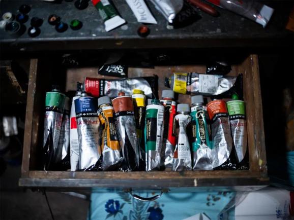 ● 结束了一天的工作后,位光明清理调色板,准备画画。