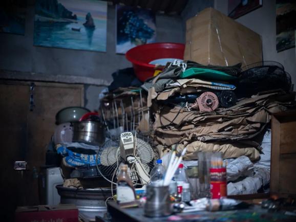 ● 屋中堆积的废品接近两米高。他独自租住了一间不到20平方米大小的平房,每月房租300元,屋内近一半空间被他收来的废品堆满。泡面、馒头,他长年累月地吃着,厨具上落了一层灰,被收纳在高处。近几年,他唯一添置的“大件”是一台废旧的电脑,花100元收购得来,用于自学油画教程,从忻东旺的《白菜》到郭润文的人物写生,他跟着视频,反复练习调色要点。