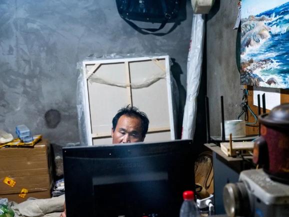 ● 在出租屋中作画的位光明。不收废品时,他每天可以完成两幅订单。位光明在绍兴市越城区东堰村生活了18年,村里人都知道他,“老位,收废品的,安徽人。”现在,他又多了一个称呼,“网红画家”。
