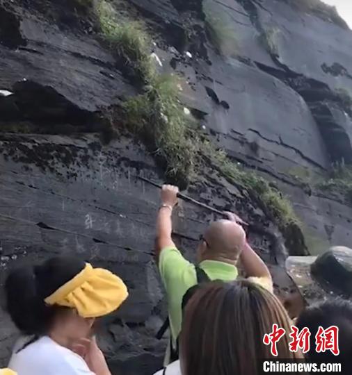 图为游客在梵净山一岩壁进行涂刻。 视频截图