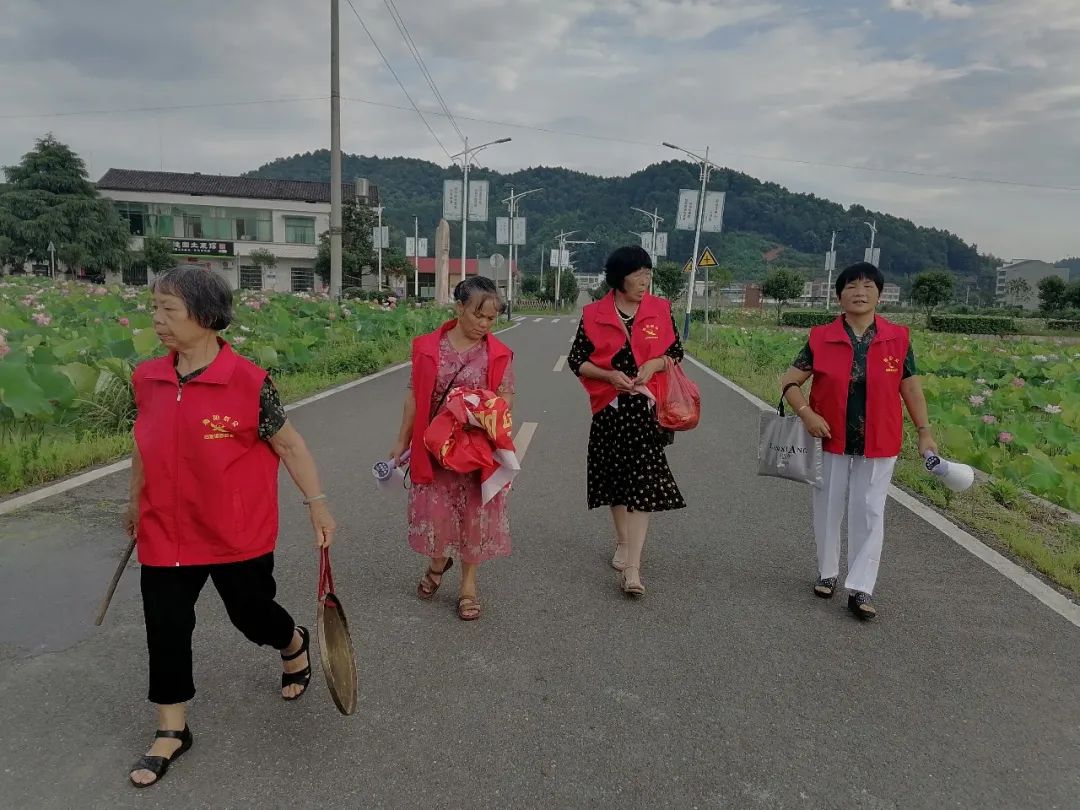 7月10日,衡阳市衡东县白莲镇白莲村,吃完午饭稍作休息后,正是一天中气温最高的时候,村妇联主席向淑云穿上自己的小红马甲,提着一面锣,和几名村妇联执委一起来到约好的“千年白莲风情园”石碑下,此时,这里已经三三两两聚集了不少同样穿着红色马甲的执委们。布置任务后,大家分成了3队朝着村子三个不同的方向出发。