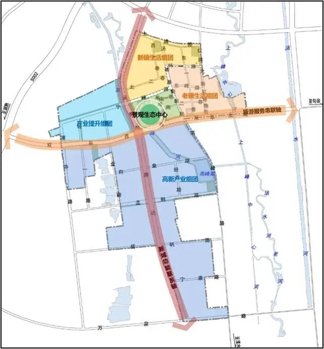 四组团——老镇生活组团、新镇生活组团、产业提升组团、高新产业组团。