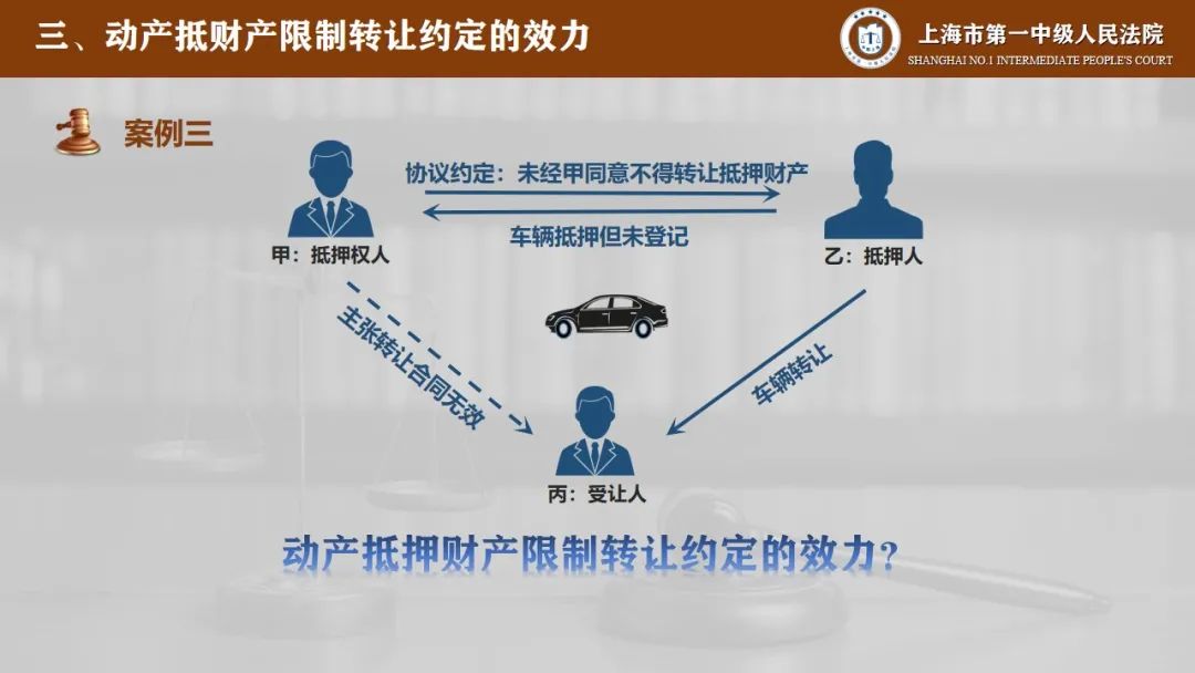 第三部分是动产抵押财产限制转让约定的效力,抵押期间抵押人可以转让抵押财产,但抵押权人和抵押人之间也可以约定禁止或者限制转让抵押财产。