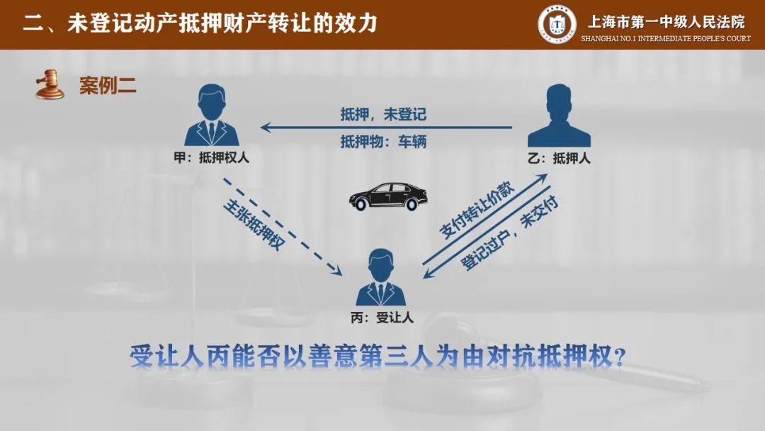 说到这里我们就可以再来看一下刚才这个案例,案例当中买受人丙虽然已经支付了价款并且办理了车辆过户,但因为没有进行交付,所以丙并未取得车辆的所有权,他依然是一位一般债权人,不属于善意第三人的范围,自然也就无法对抗抵押权人甲的抵押权。