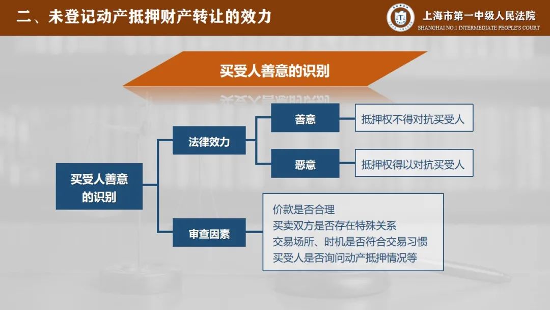 买受人主观上是否为善意是实践中的审查难点,对此我们认为可以结合价款是否具有明显不合理、交易对象是否具有特殊关系、交易场所和时机是否符合交易习惯、买受人是否询问过动产抵押的情况等等情形来予以综合认定。在证明责任分配上,受让人无需举证证明其自身为善意,而应当由未登记的动产抵押权人来举证,证明买受人知道或者应当知道存在抵押权。