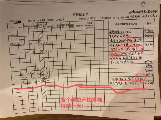 九、手术护理记录单标用了电刀,但无贴电极板的位置,护理记录单中5月2-4号患者几次诉疼痛,均只给予止痛处理,未见任何辅助检查及处置。