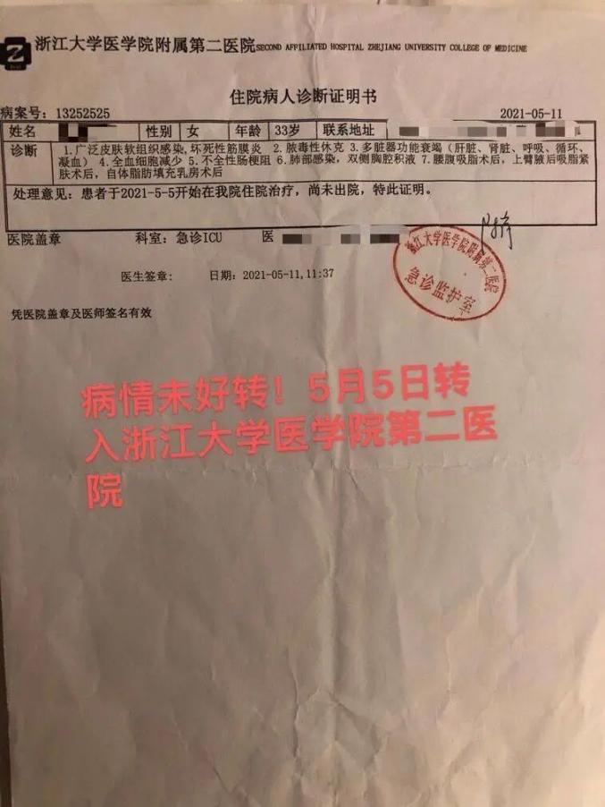 “看到这些生冷的文字,我们都能感受到她当时的痛苦。我们后面才了解到,是小冉疼得不行自己打的120急救电话,才被送去的医院。“家属告诉记者,华颜医疗在小冉表达痛苦的时候只采用了简单的用药,以为是普通抽脂手术的疼痛但一直没有得到缓解,期间曾休克昏迷医生还以为她是在睡觉。5月5日,经家人商榷,小冉被转入浙江大学医学院附属第二医院进行治疗,在转院的过程中家人第一次见到术后的小冉,多器官衰竭,前胸到肚子皮肤大面积溃烂,浮肿。
