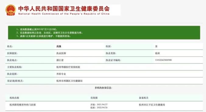 天眼查信息据国家卫健委医生执业注册信息查询显示,为小冉进行吸脂手术的主刀医生高强的医师级别为执业医师,执业范围为外科专业。多机构备案信息显示,除了在杭州华颜医疗美容医院执业外,高强还在杭州群英整形外科门诊部有执业备案。