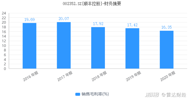 同花顺iFinD数据显示,顺丰控股的毛利率从2017年的20.07%逐渐下滑至2020年的16.35%,并在今年第一季度达到16%的水平。