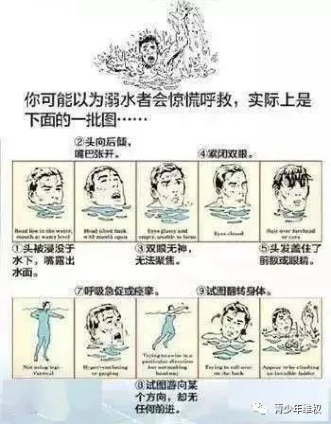 7、溺水最重要的迹象就是看起来不像溺水,他们看起来可能只是抬头在看天空、岸际、泳池边或码头。这个时候你要问:“你还好吗?”如果他们能回答,大概就没事。如果眼神涣散,可能只有不到半分钟的时间救他们一命。