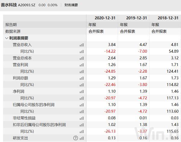 善水科技2018-2020年期间,其营业收入分别为4.81亿元、4.47亿元和3.84亿元;扣非后净利润分别为1.43亿元、1.38亿元和1.02亿元。